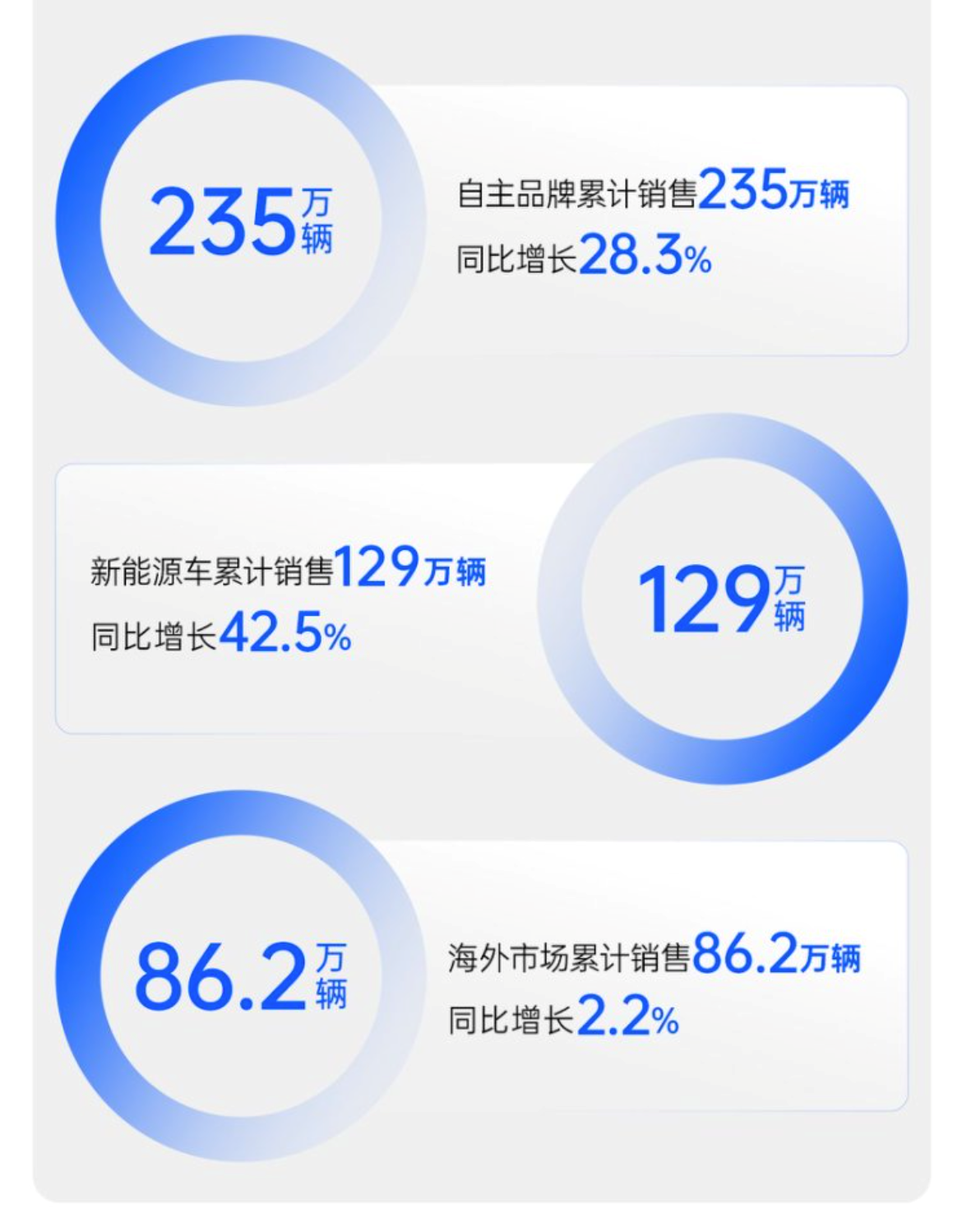 根据上汽集团官方发布数据,今年10月,上汽集团整车销售量达到45.4万辆,同比增长13%。在自主品牌、新能源、海外市场“新三驾马车” 强力拉动下,今年以来上汽月销量已实现同比“十连涨”。前10月累计实现整车批售364.7万辆,同比增长19.5%,终端零售383.4万辆,领跑国内行业。